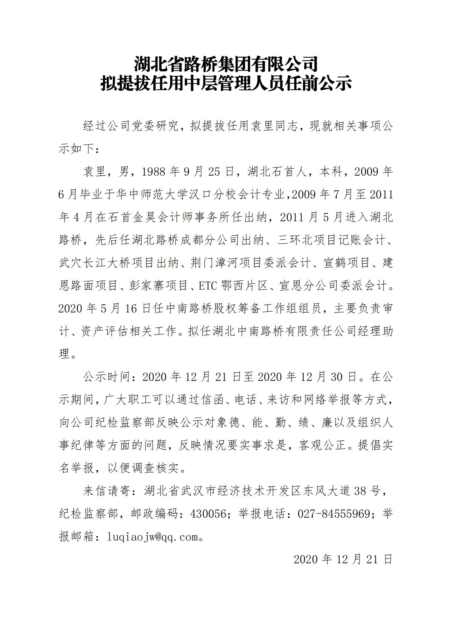 湖北省路橋集團(tuán)有限公司擬提拔任用中層管理人員任前公示