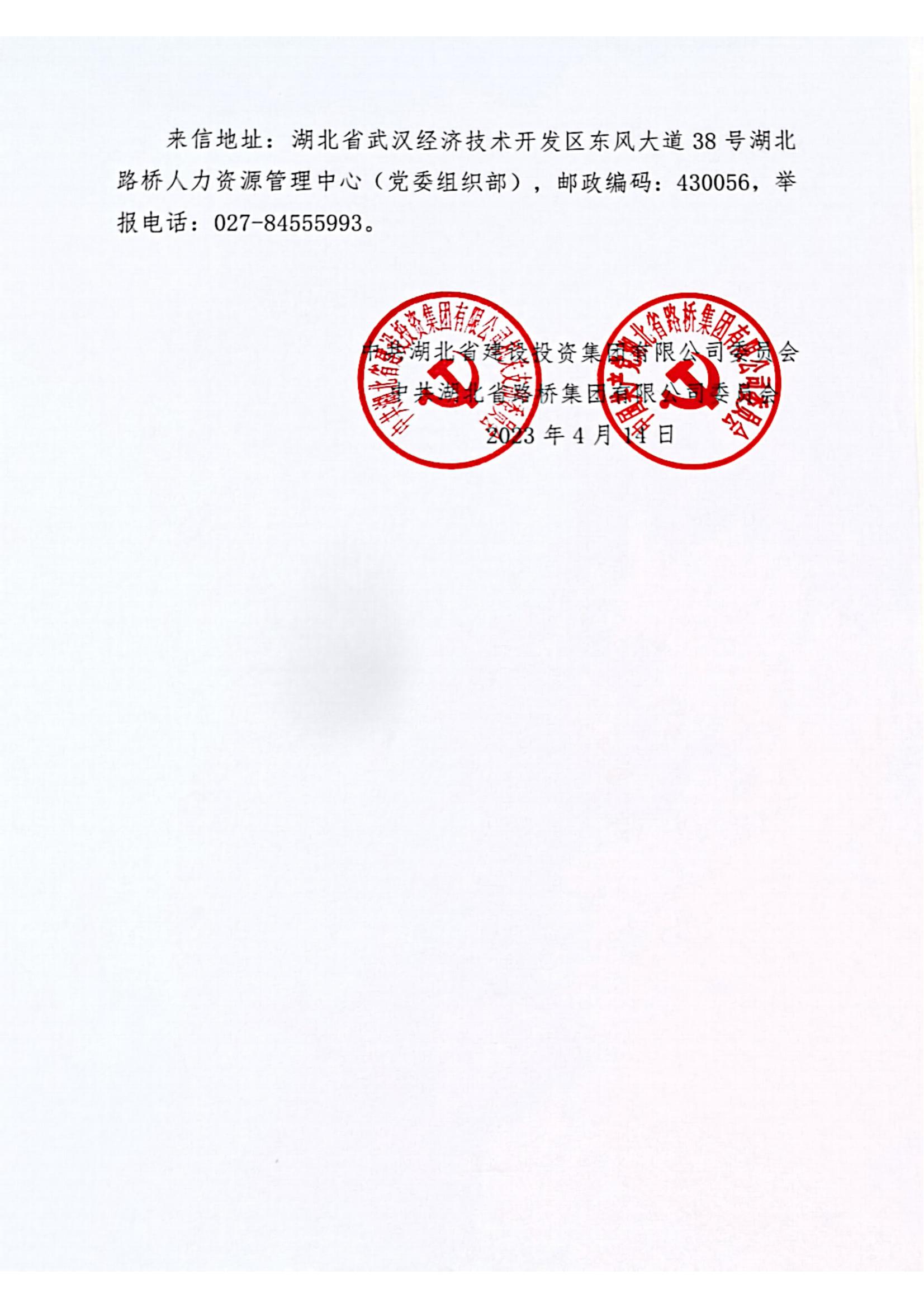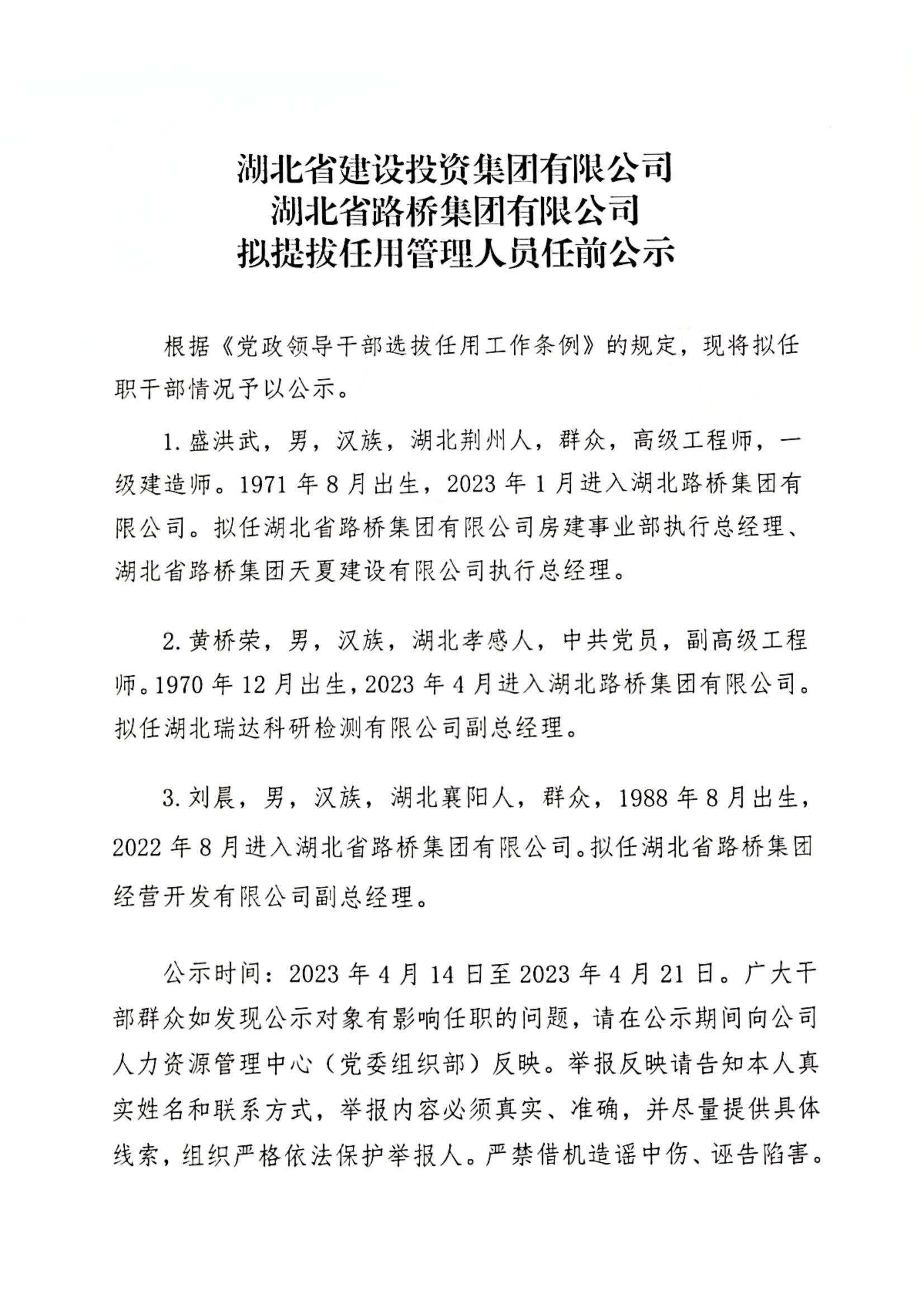 湖北省路橋集團(tuán)有限公司擬提拔任用管理人員任前公示