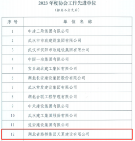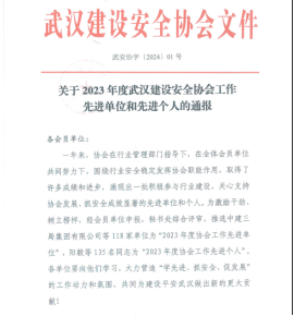 初心如磐守安全,砥礪奮進(jìn)譜新篇。近日,武漢建設(shè)安全協(xié)會(huì)就2023年建筑行業(yè)安全生產(chǎn)方面評(píng)選了一批先進(jìn)單位和先進(jìn)個(gè)人,湖北路橋天夏公司榮獲“2023年度協(xié)會(huì)工作先進(jìn)單位”稱號(hào),天夏公司副總經(jīng)理殷玉華、安全總監(jiān)付建國(guó)榮獲“2023年度協(xié)會(huì)工作先進(jìn)個(gè)人”稱號(hào)。