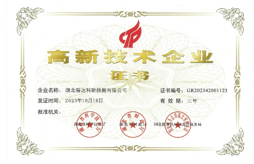 近日,湖北路橋瑞達(dá)檢測(cè)公司收到由湖北省科學(xué)技術(shù)廳、湖北省財(cái)政廳、國(guó)家稅務(wù)總局湖北省稅務(wù)局共同頒發(fā)的“高新技術(shù)企業(yè)”證書,這是瑞達(dá)檢測(cè)公司首次榮獲此項(xiàng)認(rèn)定,標(biāo)志著瑞達(dá)檢測(cè)公司在科技創(chuàng)新和產(chǎn)業(yè)升級(jí)方面取得了重要突破,正式邁入國(guó)家高新技術(shù)企業(yè)行列。