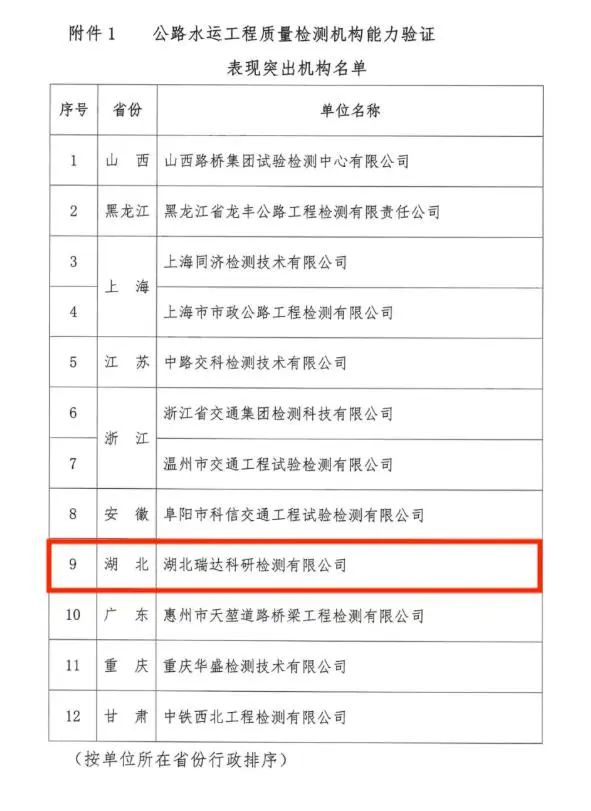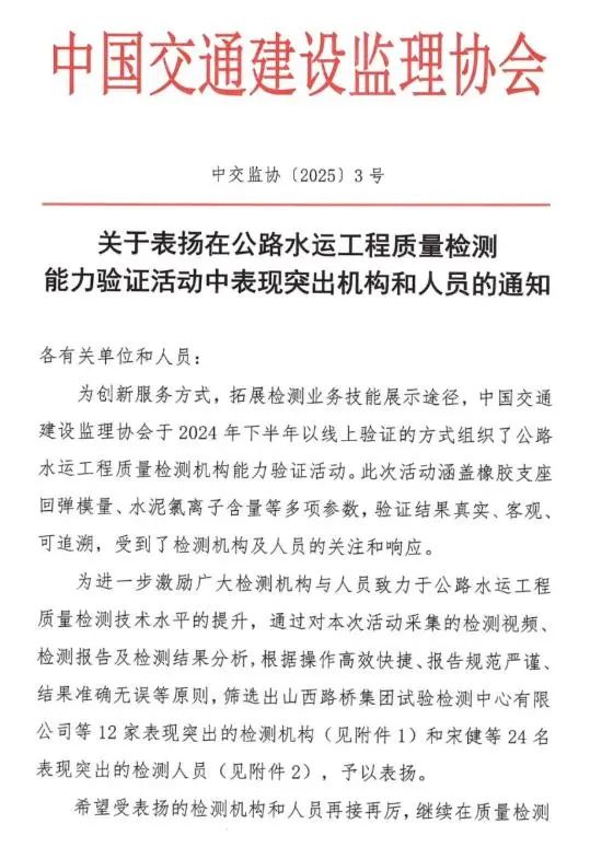 1月9日,中國交通建設(shè)監(jiān)理協(xié)會(huì)發(fā)布表彰通知,瑞達(dá)科研檢測(cè)公司成功蟬聯(lián)第二屆公路水運(yùn)工程質(zhì)量檢測(cè)能力驗(yàn)證“表現(xiàn)突出機(jī)構(gòu)” 榮譽(yù),是全省唯一一家連續(xù)兩屆獲此榮譽(yù)的檢測(cè)機(jī)構(gòu)。