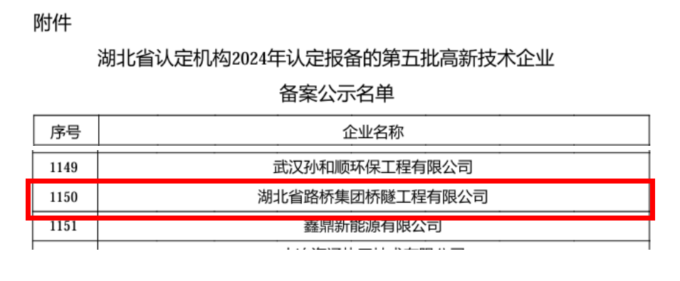 近日,全國(guó)高新技術(shù)企業(yè)認(rèn)定管理工作領(lǐng)導(dǎo)小組辦公室發(fā)布了湖北省2024年第五批國(guó)家高新技術(shù)企業(yè)的備案名單,湖北路橋橋隧公司通過(guò)認(rèn)定,正式邁入國(guó)家高新技術(shù)企業(yè)行列。這標(biāo)志著橋隧公司在科技創(chuàng)新發(fā)展道路上取得新的里程碑,開(kāi)啟企業(yè)發(fā)展新篇章。