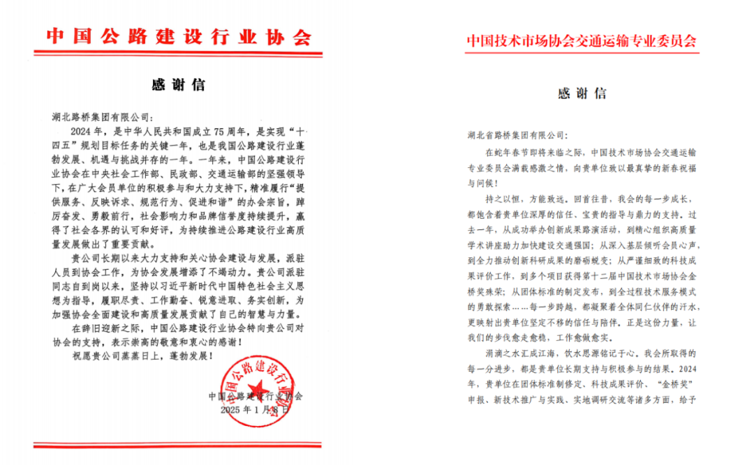 近日,湖北路橋收到來(lái)自中國(guó)公路建設(shè)行業(yè)協(xié)會(huì)、中國(guó)技術(shù)市場(chǎng)協(xié)會(huì)交通運(yùn)輸專業(yè)委員會(huì)發(fā)來(lái)的感謝信,信中對(duì)湖北路橋大力支持和關(guān)心協(xié)會(huì)建設(shè)與發(fā)展,積極參與協(xié)會(huì)各項(xiàng)科技創(chuàng)新、評(píng)優(yōu)創(chuàng)獎(jiǎng)活動(dòng)表達(dá)了肯定與感謝。