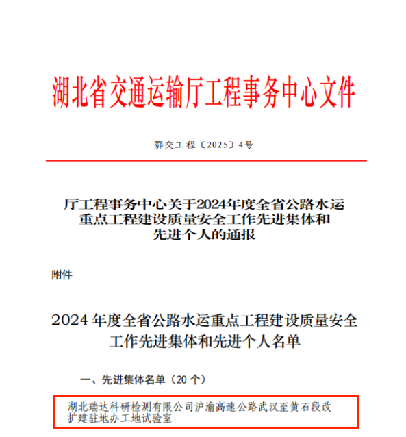 近日,湖北省交通運(yùn)輸廳工程事務(wù)中心發(fā)布了《關(guān)于2024年度全省公路水運(yùn)重點(diǎn)工程建設(shè)質(zhì)量安全工作先進(jìn)集體和先進(jìn)個(gè)人的通報(bào)》,瑞達(dá)科研檢測(cè)公司武黃改擴(kuò)建高速公路駐地辦工地試驗(yàn)室在工程建設(shè)過(guò)程中扎實(shí)落實(shí)安全質(zhì)量責(zé)任,切實(shí)履行檢測(cè)機(jī)構(gòu)使命,憑借突出表現(xiàn)榮獲“先進(jìn)集體”稱(chēng)號(hào)。