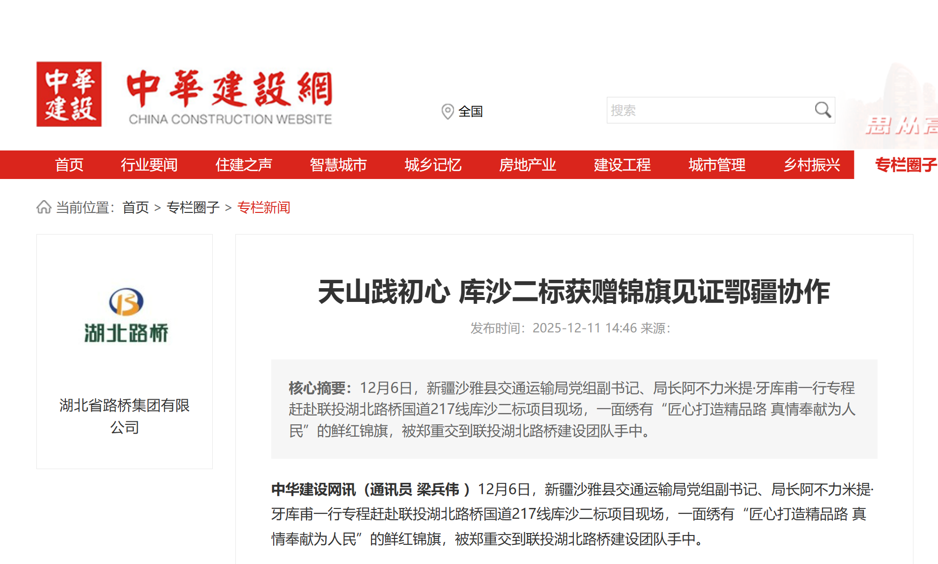 近日,聯(lián)投湖北路橋國(guó)道217線庫(kù)沙二標(biāo)項(xiàng)目收到新疆沙雅縣交通運(yùn)輸局的錦旗,中華建設(shè)網(wǎng)、經(jīng)視直播對(duì)該事件進(jìn)行報(bào)道,以下是報(bào)道全文: