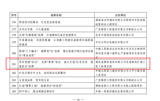 5月16日,中國(guó)施工企業(yè)管理協(xié)會(huì)公布了2024年“工程建設(shè)企業(yè)黨建工作優(yōu)秀成果”的名單,湖北路橋京港澳改擴(kuò)建工程1標(biāo)項(xiàng)目成功獲評(píng)“工程建設(shè)企業(yè)黨建工作優(yōu)秀二等成果”。