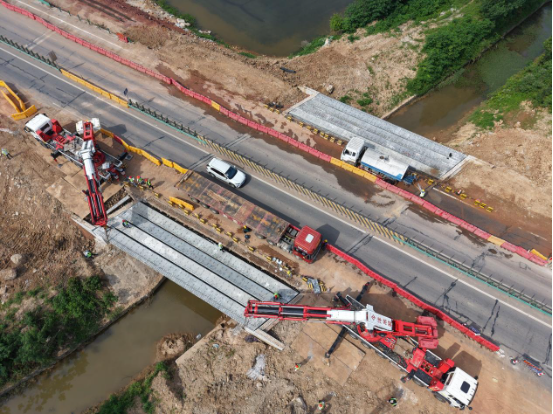 面對施工場地限制、高壓線路影響、邊通車邊施工等復雜難題,施工單位湖北省路橋集團有限公司通過精密設(shè)計演算,創(chuàng)新性提出采用85t折臂吊車方案,通過減少吊車配重、壓縮車輛轉(zhuǎn)幅半徑,既滿足現(xiàn)場實際施工需求,又顯著提高了吊裝作業(yè)的安全性能與機動性。同時,該公司成立技術(shù)、安全、施工專項工作組,聯(lián)合建設(shè)單位、監(jiān)理單位構(gòu)建“三位一體”安全管控體系,安排專人配合公安交管部門引導交通,全過程保障碧石港橋、瑪瑙嘴橋拼寬段32片空心板吊裝作業(yè)安全。